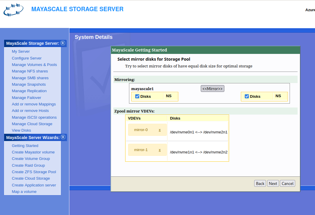 Select NVMe disks to pair and click Mirror to establish mirroring