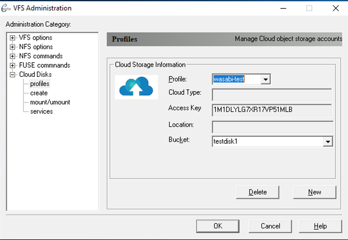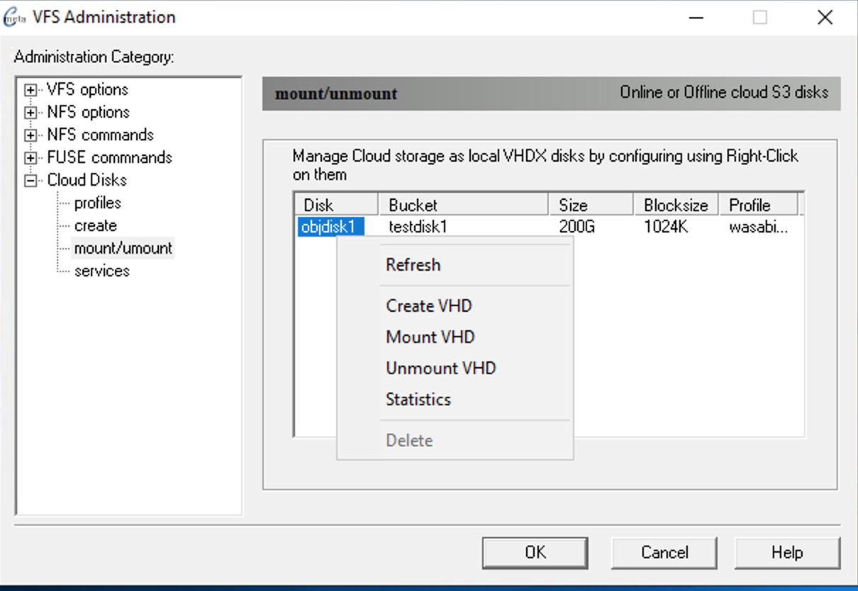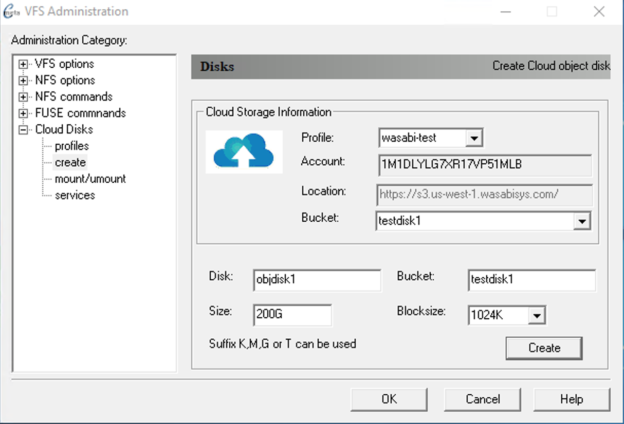 Select the cloud profile to use for creating object storage disk. You can select an existing Bucket from the list or enter one manually which will create a new bucket for you. Logical size of VHDX up to 64TB allowed by Windows. Fill in the following information for the new Disk