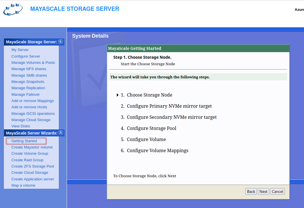 Connect to Administration Web console available on http://<mayascale1-ip>:2020 and login as admin and click Getting Started