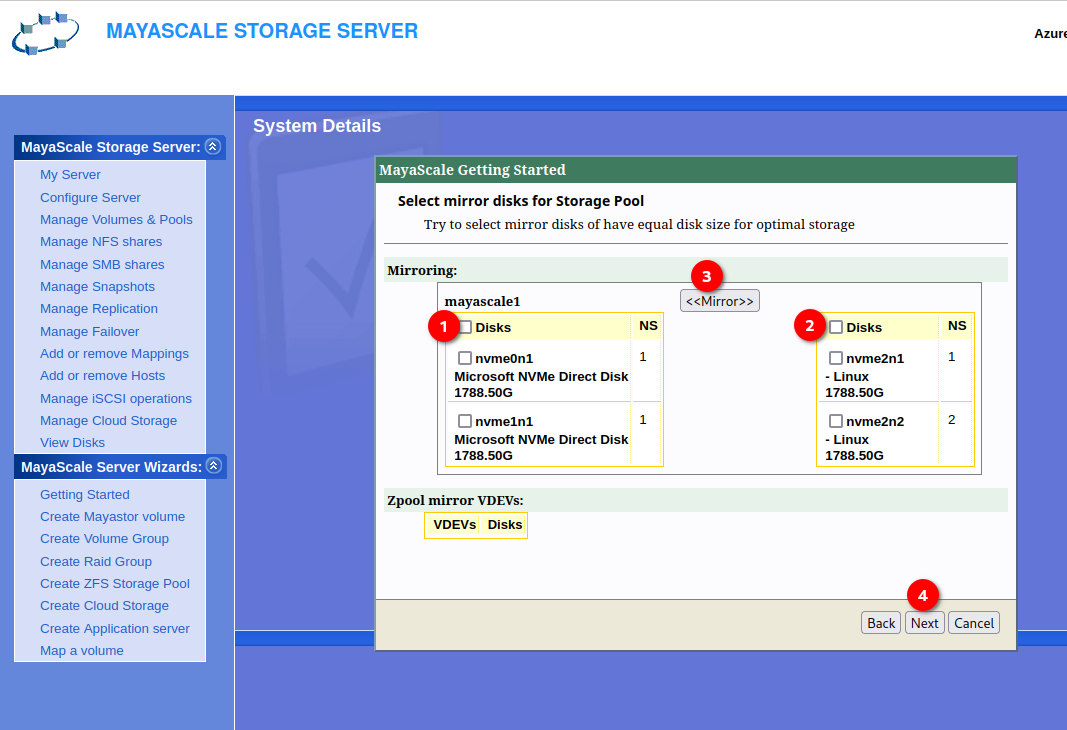 Select NVMe disks to pair and click Mirror to establish mirroring