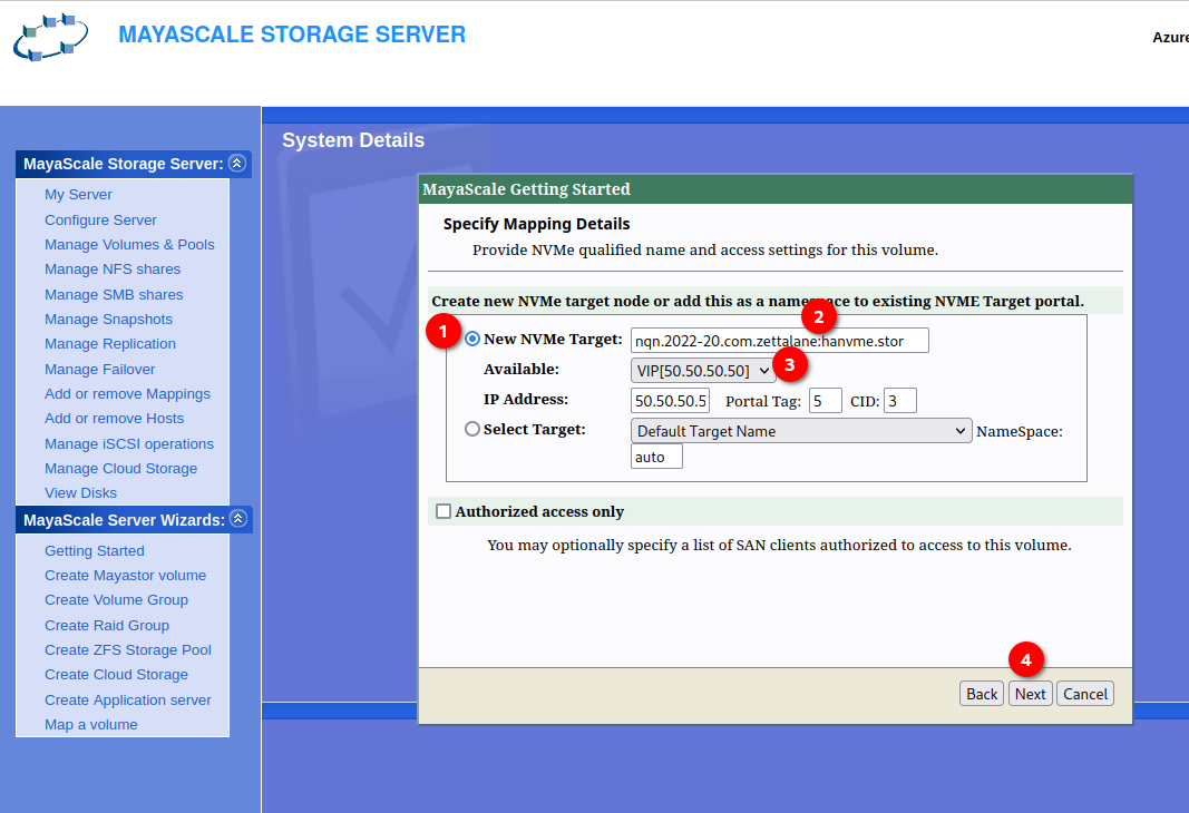 • New NVMe Target: Click on this radio button to create new NVMe target for the first mapping to make use of Virtual IP address
