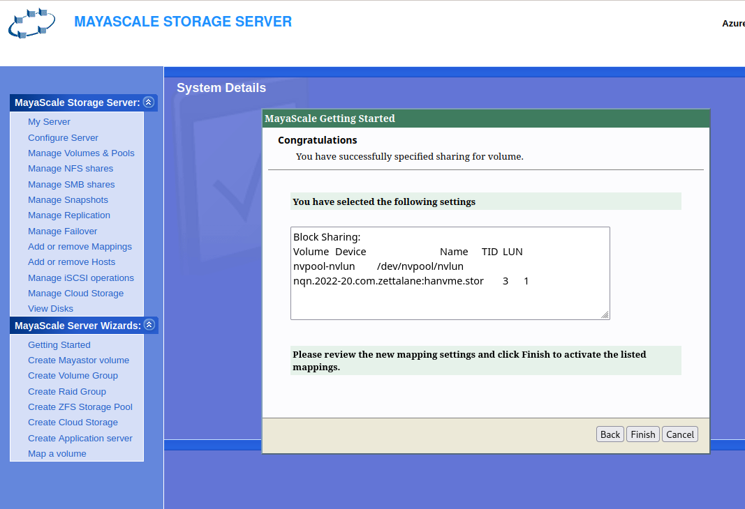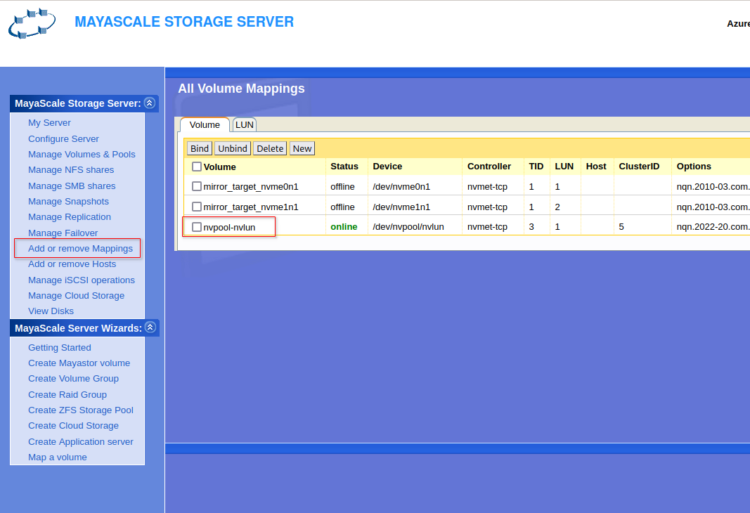 Occasionally the mappings may not be active due to delay in activation of the Virtual IP address in Azure environment. In that case you may manually activate by selecting the volume and clicking Bind