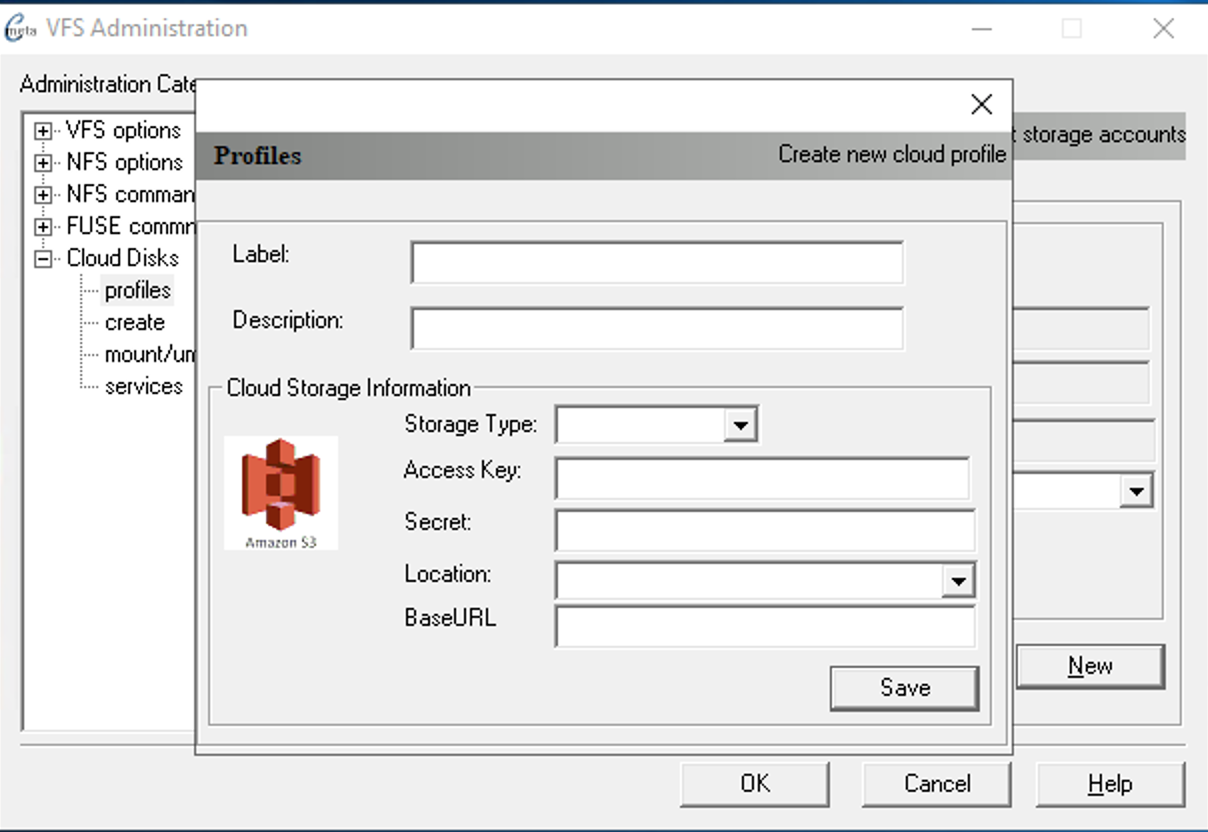 Use profiles → New to create a cloud profile that provides relevant information for accessing the cloud storage from application. To start with the configuration you would need access ID key and secret key generated by your cloud provider from their console settings. It is also possible to skip providing this information, if the compute engine was already authorized to perform S3 object access operations through IAM settings.