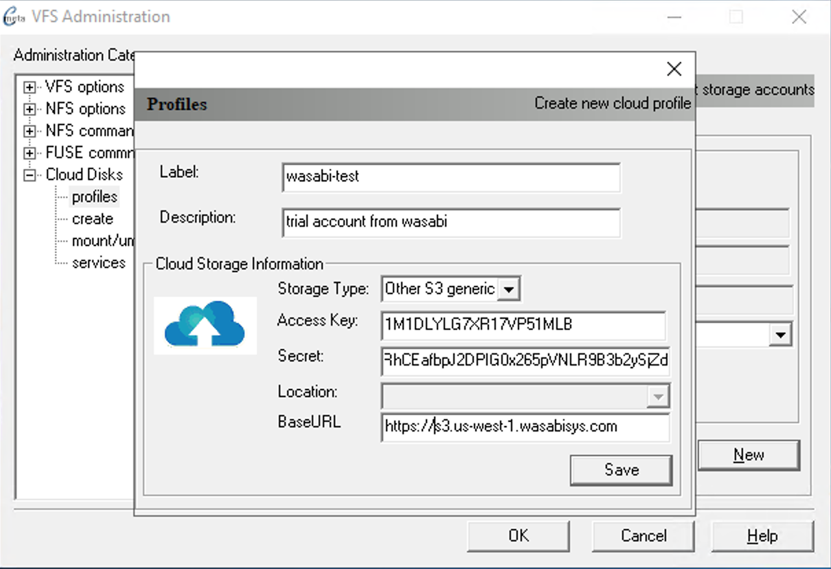 The following dialog shows how to configure cloud profile for Wasabi Technologies which comes under Other S3 generic category. In this configuration BaseURL is required to match their service URLs